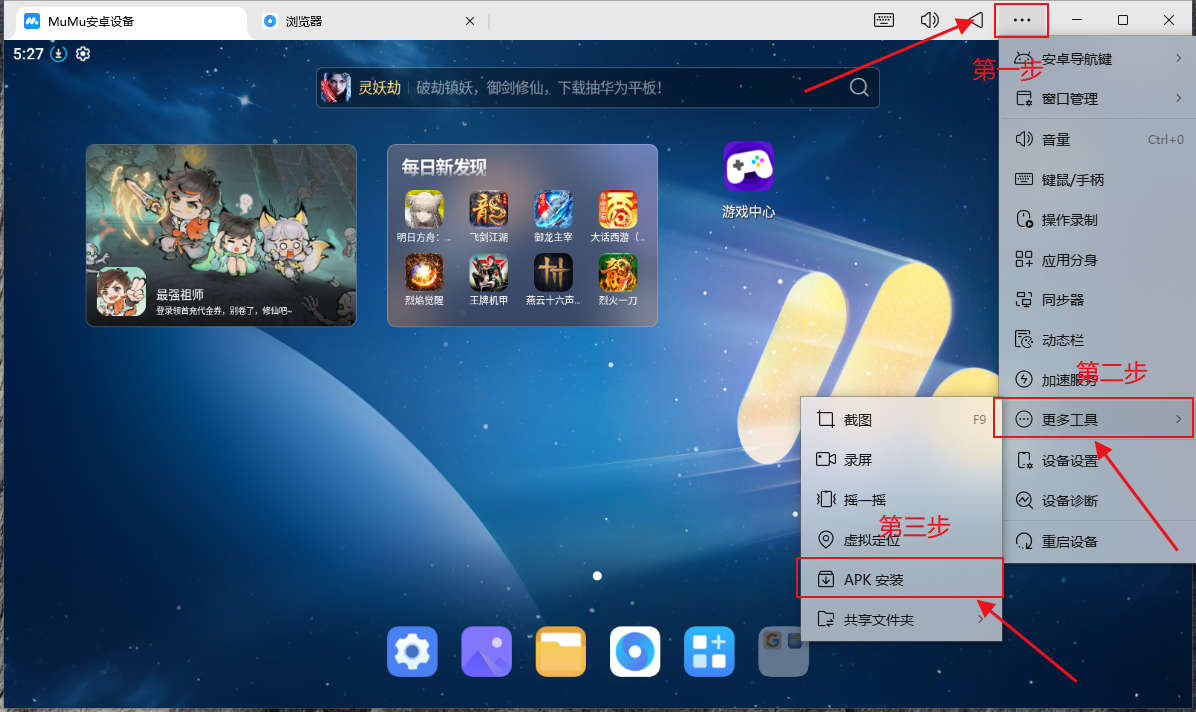 下载游戏APK完毕后,可以使用模拟器APK安装功能安装游戏进模拟器,如下图所示(或者直接鼠标左键拖拽进模拟器)。
